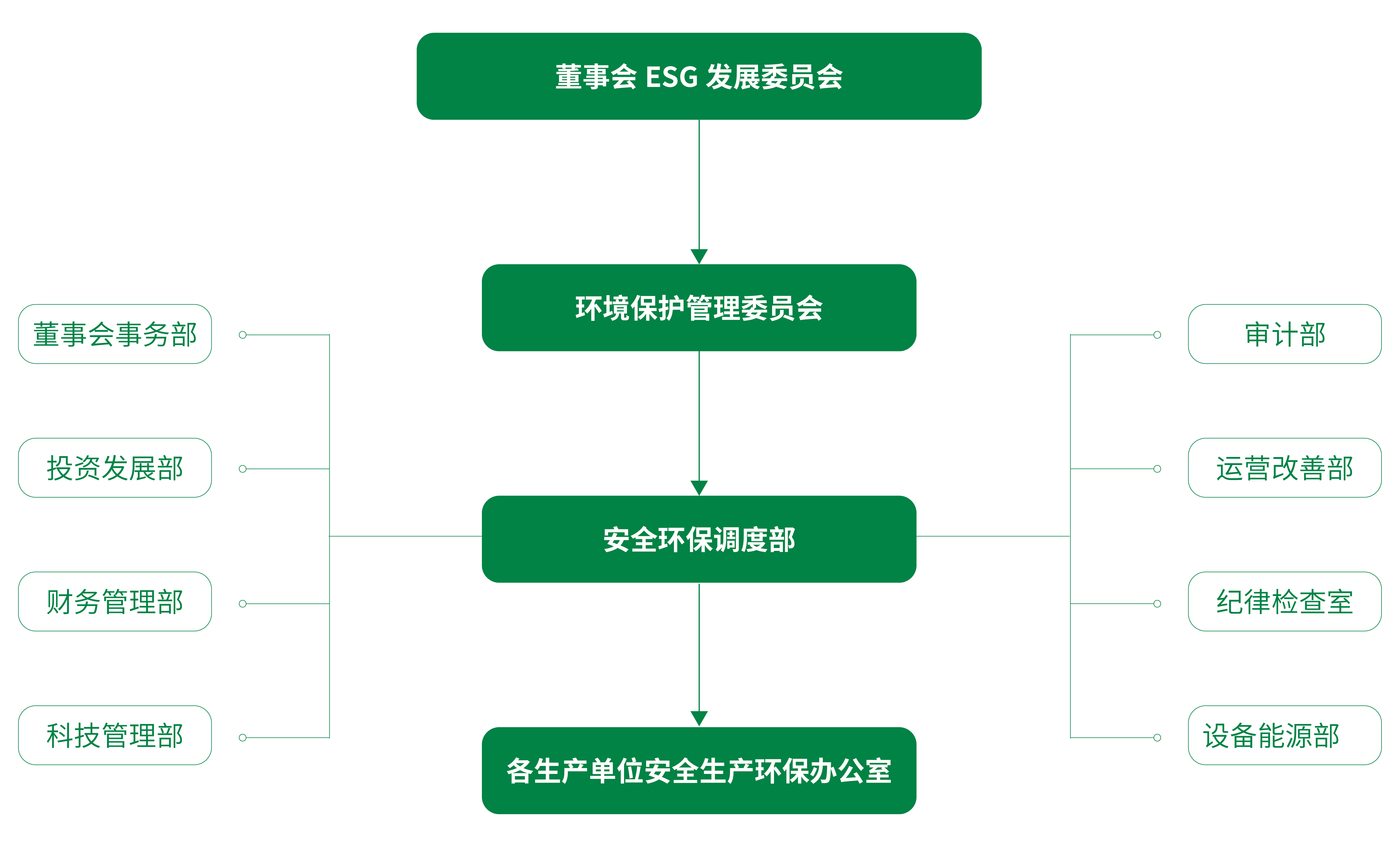 公司建立了四級的環境保護管理責任制,在決策層,董事會ESG 發展委員會負責審查公司環境保護執行情況、研究公司環境保護的重大治理方案,指導監督重大環保事故應急處理;在管理層,設立環境保護管理委員會,負責公司環保工作的研究、決策和協調工作;在公司職能部門層面,設立生產安全環保部,在其他部門配合下負責規劃、監督和管理各生產單位的環保工作執行;在執行層面,下屬各分子公司均按照公司模式設立環境保護管理委員會與安全環保管理部門,全面負責該單位環保工作的開展與日常監督,受公司生產安全環保部和各個單位負責人的監督管理。